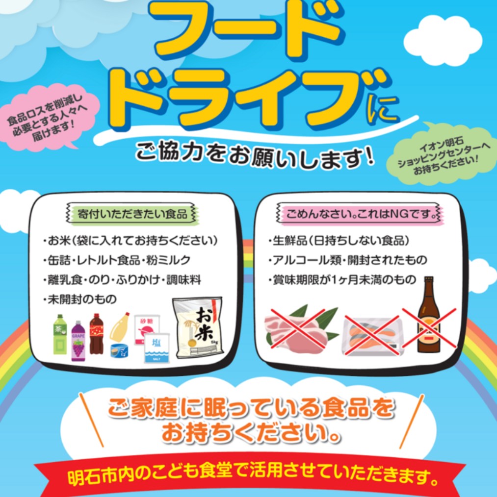 食品ロスを減らしながら、必要としている人たちへ食品を届けるフードドライブが、イオン明石ショッピングセンターで開催されます。寄付された食品は明石市内のこども食堂で活用されます。